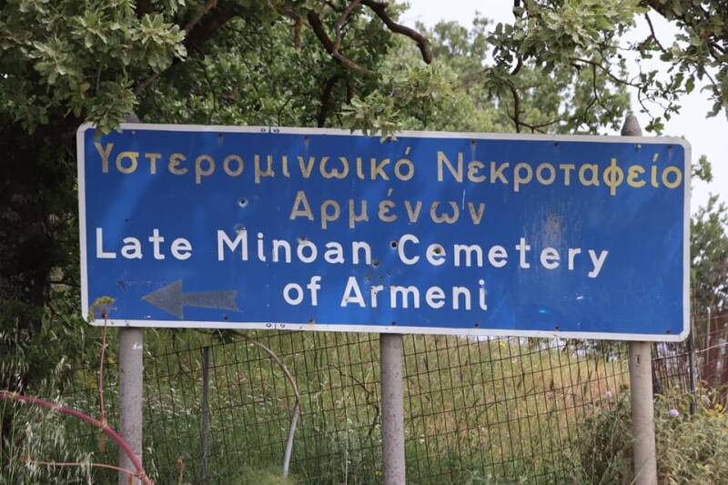 Op de Minoïsche begraafplaats van Armeni vindt u ruim 200 grafkamers uit de late Minoïsche tijd (de zgn. Na-paleisperiode). De opgraving van deze grafkamers is in de vroege zeventiger jaren begonnen onder leiding van de archeoloog Tzedakis en zijn tegenwoordig nog steeds aan de gang. De graven bestaan uit een gang en een kamer die uitgehouwen zijn in een harde steensoort. De gang van de grafkamer is vrij lang en wordt steeds dieper en smaller. De kamers verschillen per graf van vorm, u vindt er ronde kamers, ovale kamers, vierkante kamers en zelfs hoefijzervormige kamers. In sommige gevallen bestaat de kamer slechts uit een uitholling in de grond. Door de hardheid van dit gesteente zijn de grafkamers goed bewaard gebleven. In de grafkamers zijn de skeletten van ongeveer vijfhonderd mensen ontdekt. Uit onderzoek op deze skeletten zijn veel waardevolle gegevens voortgekomen, die een goed beeld vormen van de levenswijze van deze personen. Ook zijn er in en nabij de grafkamers grote hoeveelheden aardewerk, werktuigen en sieraden gevonden. De pronkstukken van deze opgraving (helaas niet te bezichtigen) zijn een aantal fraai versierde sarcofagen. De Minoïsche begraafplaats van Armeni is op de maandagen na elke dag geopend van negen uur ’s morgens tot drie uur ’s middags. Voor een bezoek aan de begraafplaats betaalt u helemaal niets, er wordt namelijk geen entree geheven. Na een bezoekje aan de graven is een drankje op het dorpsplein altijd een goed idee.