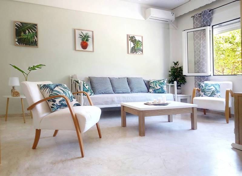 Van de woonkamer kunnen we, op verzoek, een derde slaapkamer maken met een 1-persoons bed. Verder vindt men in de woonkamer toeristische boeken en informatie over Kreta, gezelschapsspellen, een grote flatscreen TV en airconditioning. Voor kleine kinderen is er speelgoed en voor baby's is er een wipstoeltje, baby speelgoed en een speelmat.