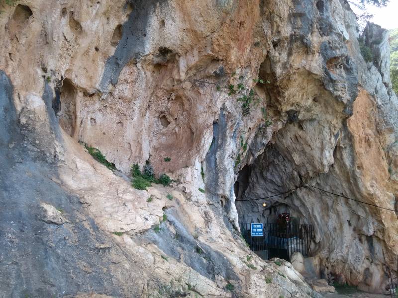 Vanop dat lagergelegen “platform” gaan we langs een pad omhoog naar de ingang van de grot. Het is aangeraden om een zaklamp bij te hebben, want er is geen verlichting binnen de grot. Jullie zullen wel lichten zien hangen, maar die branden enkel tijdens de viering van de Heilige Fotini.