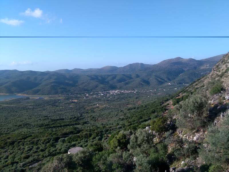 Voor ons zien we een indrukwekkende uitholling. Die uitholling is er gekomen door plotselinge verandering van de kalksteenachtige rots. Van daaruit heeft men een prachtig uitzicht over de hectaren olijfgaarden die Avdou omringen.