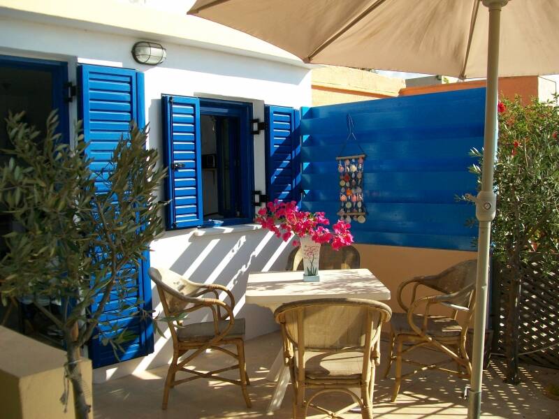 Het huis met terras van 30m2 aan de voor- en achterkant heeft een fraaie pergola op het terras waaronder u kunt genieten van het geweldige uitzicht op de baai van Sissi en het levendige haventje. In de zomermaanden ligt er UV-doek op de pergola.
